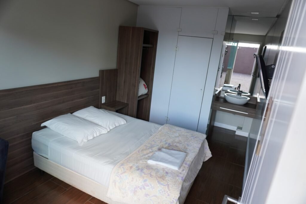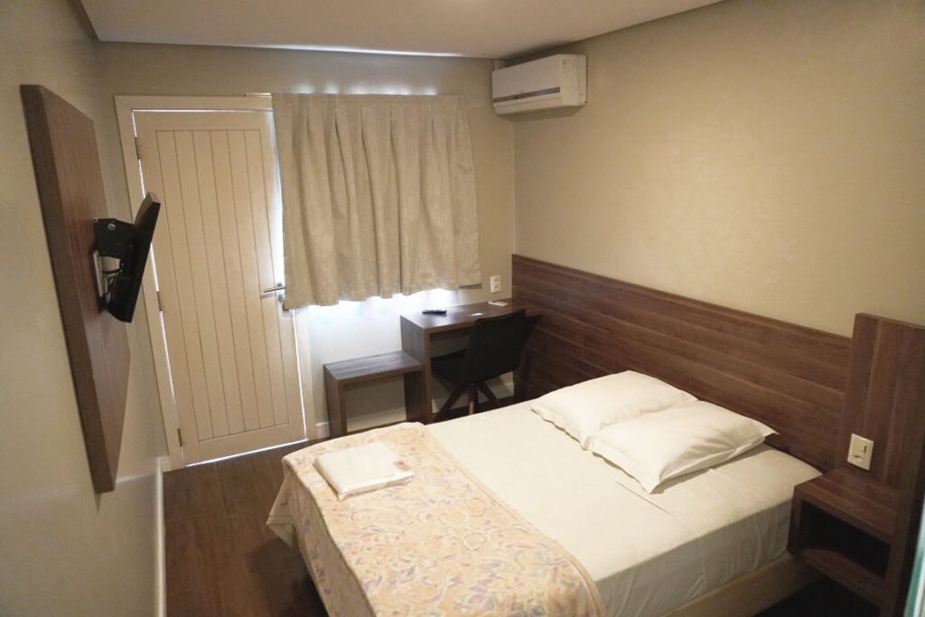 Quarto aconchegante com cama de casal, ar-condicionado e TV.