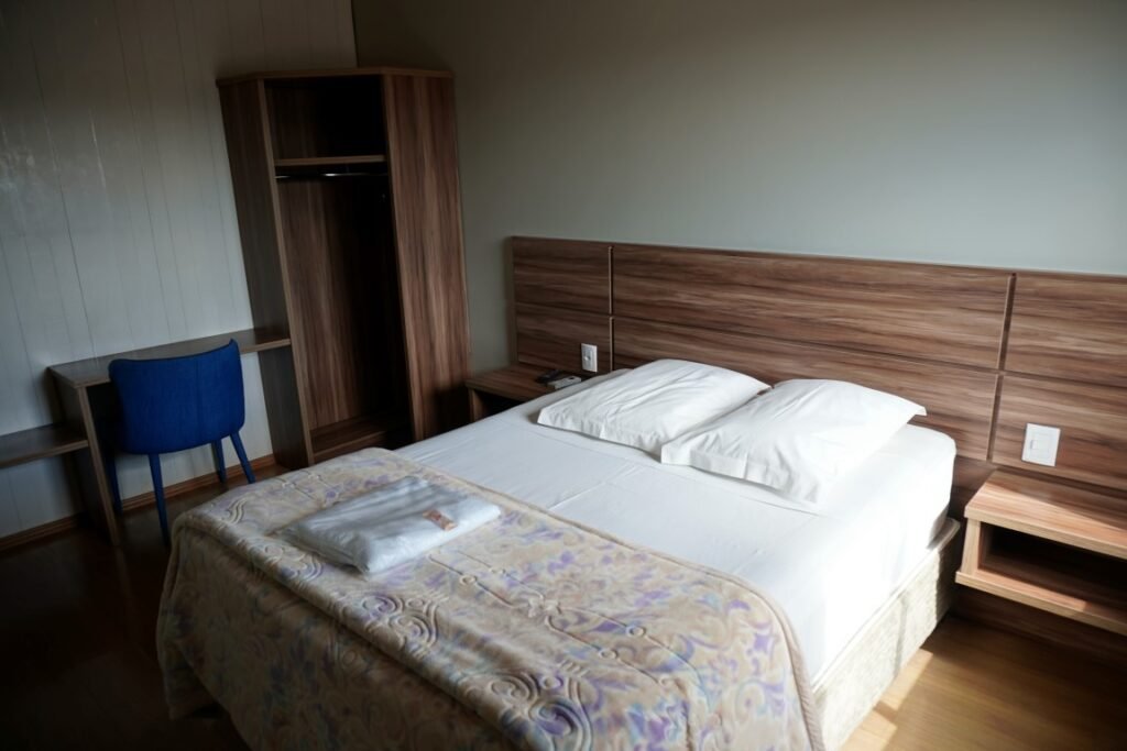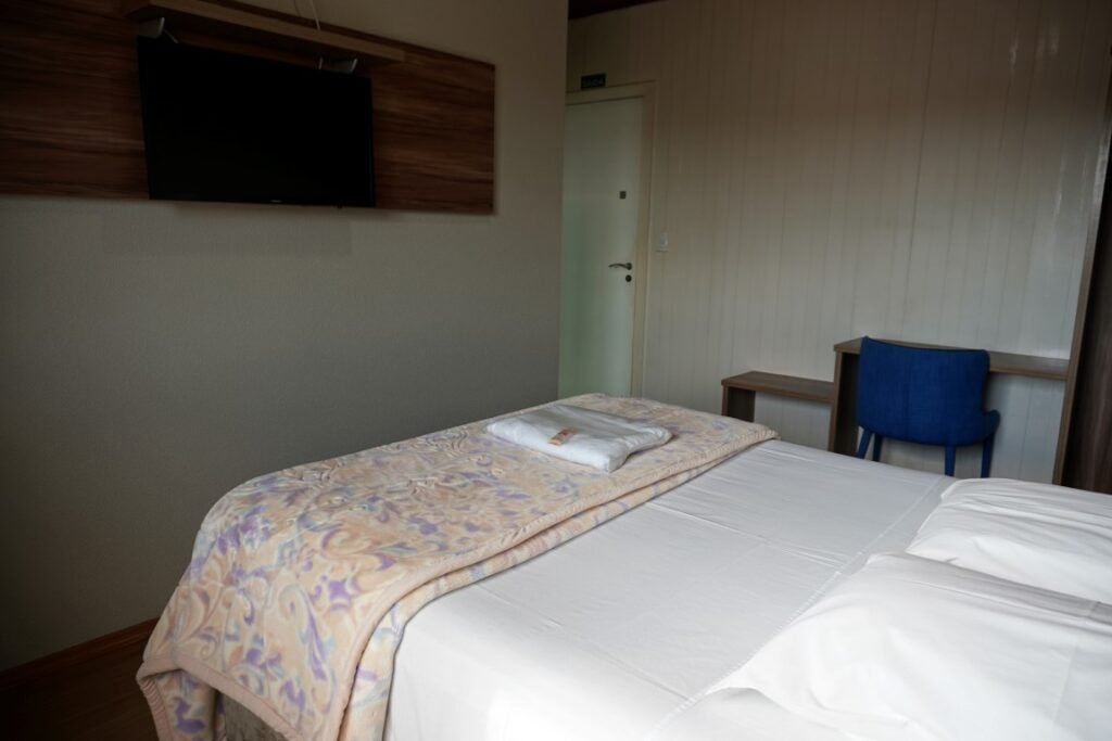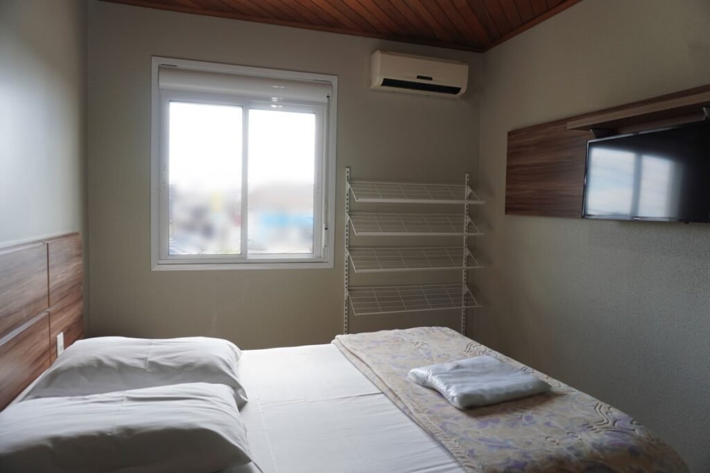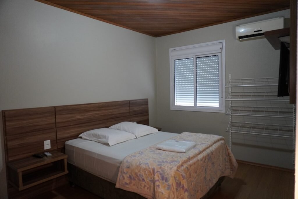 Quarto aconchegante com cama de casal, ar-condicionado e TV.